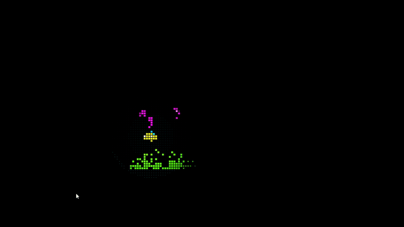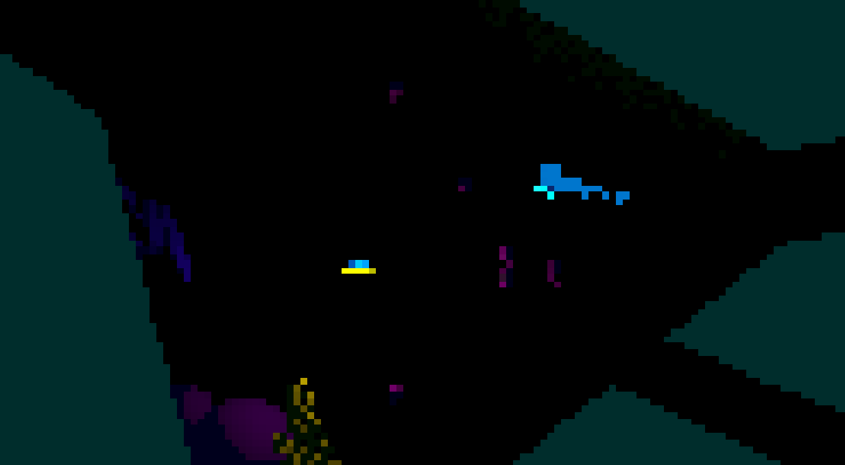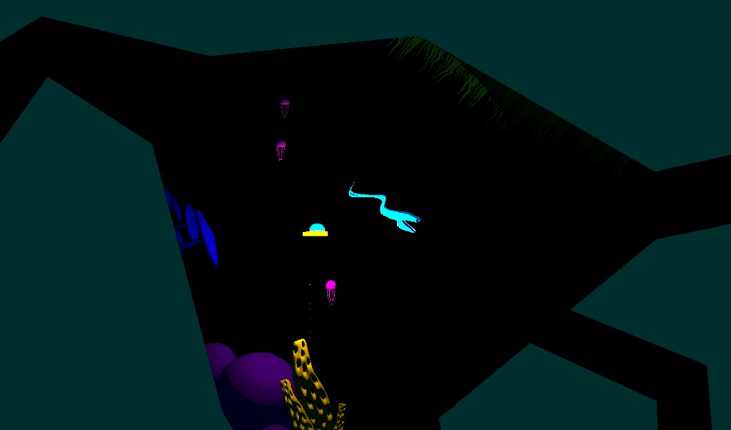 The idea behind this game is to simulate the deep sea in an abstract fashion. 80% to 90% of screen is pitch black and the colours are all on a large grid that can move with player abilities. The challenge was to still make the game legible, working with these quite extreme constraints.
