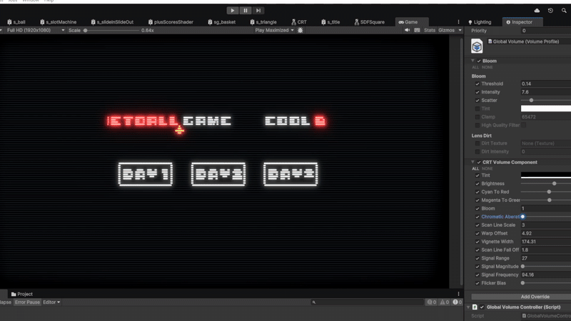 Chromatic Aberration occurs as the electron beams age. Each beam of a CRT is either red, green or blue and all must hit the same physical point on the screen. When the accuracy wears off chromatic aberration starts to occur. These beams were prone to bloom sensitive, where lighter colours bled into neighbouring phosphor dots (CRT version of pixels). Unity’s default bloom shader sufficed well so I won’t go into much detail about that. One thing I’ll say is to replicate the CRT sensitivity, I lowered the bloom threshold. To achieve the chromatic aberration effect, I sampled the blit texture three times, each with an offset controlled in the Unity scene. One channel of each blit texture was added to a new float3, creating a similar camera texture, but with each RGB channel slightly offset from the centre of the screen.